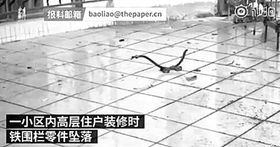 小区高空抛物接连掉下铁栏杆 业主戴头盔出入