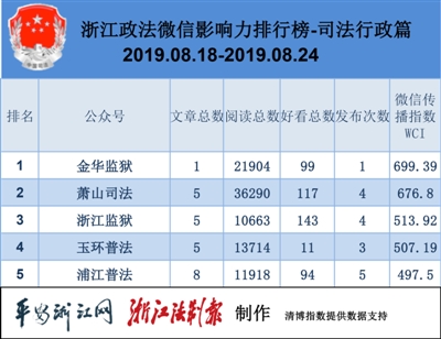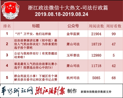 过去一周,“金华监狱”拿下了双料冠军,“萧山司法”紧随其后,成为榜单新秀。一直默默无闻的“萧山司法”是如何内练功夫的?从其热文《法治故事演讲比赛(初中组)最佳人气奖由你决定!为你喜爱的选手投个票吧》就可以看出,不管什么题材,做到接地气就能为自己加分不少。