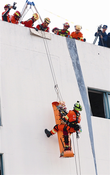 上午9时57分,正在进行的是香港救援队参与的深井向下破拆救援。一切准备就绪后,第一名消防员进入井内,18分钟就顺利完成井内破拆任务。10时21分,井内消防员发现有“伤员”被困,第二名救援人员进入井内支援,在设置好上升系统后,通过对讲机指挥井口的消防员将“伤员”拉了上来。随后,等候一旁的一名消防员熟练地进行了缠胶布、量血压等紧急医疗处理,再用多功能担架沿着墙体将“伤员”送至地面。整个救援过程,动作行云流水,队员之间配合度相当高。现场观摩的消防员纷纷鼓掌叫好。