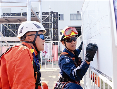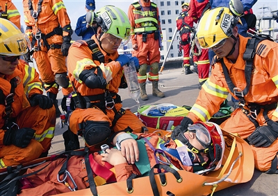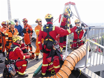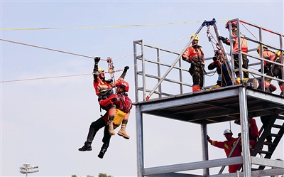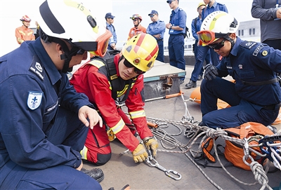 现场进行的,还有孤岛救援、开放水域动力橡皮艇避障救援、城市高架路多车连环相撞事故救援、狭小空间破拆救援和倾斜通道横向救助等项目,来自各国各地区的消防员在开展救援任务中相互交流沟通,然后合力完成每一项救援任务。