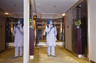 “用过的拖布和抹布要以有效氯含量为1000mg/L的含氯消毒剂浸泡消毒30分钟。”“物品、家具表面等可能被污染的区域每天要消毒2次。”“厨房出入口要设置紫外线消毒灯。”客房部经理张亮告诉记者,从客人入住到结束观察全过程,所有程序都有严格操作规程。