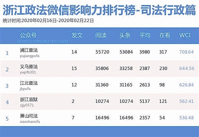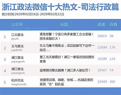 本期司法行政榜,“浦江普法”“义乌普法”“江北普法”位列前三。值得一提的是“江北普法”首次上榜就进入前三甲,其《紧急预警!宁波已有多家复工企业受骗!损失金额巨大!》一文登上热文榜第一,企业复工的同时也要谨防各类诈骗。