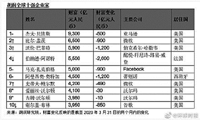 胡润财富榜: 全球富豪两个月损失2.6万亿