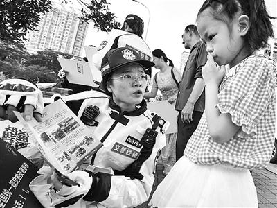 近日,宁波东部新城交警中队女子骑警队来到福明家园西门,“摆摊”宣传交通安全。自8月3日以来,女子骑警队们已前往15个小区,利用每天的早晚高峰,通过讲解交通标志标牌、交通安全知识问答、展板展示等形式,向市民宣传交通安全。