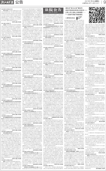 杭州市上城区人民法院(2021)浙0102民初7号 王泳淇:本院受理原告杭州宝泽汽车销售服务有限公司诉被告王泳淇追偿权纠纷一案,现依法向你公告送达(2021)浙0102民初7号起诉状和证据副本、应诉通知书、举证通知书、及开庭传票等。自公告之日起经过60日,即视为送达。本案适用简易程序,提出答辩状和举证的期限分别为公告送达期满后次日起15日内。并定于2021年4月2日上午9时30分在基金小镇法庭(杭州市上城区白云路26号)第二号法庭开庭审理,逾期将依法判决。 杭州市上城区人民法院(2021)浙0102民初6号 陈玲、季一义:本院受理原告浙江茗发融资担保有限公司诉被告陈玲、季一义追偿权纠纷一案,现依法向你们公告送达(2021)浙0102民初6号起诉状和证据副本、应诉通知书、举证通知书、及开庭传票等。自公告之日起经过60日,即视为送达。本案适用简易程序,提出答辩状和举证的期限分别为公告送达期满后次日起15日内。并定于2021年4月2日上午9时30分在基金小镇法庭(杭州市上城区白云路26号)第二号法庭开庭审理,逾期将依法判决。