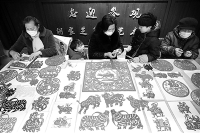 1月17日上午,桐庐县胡家芝剪纸艺术馆内,民间剪纸艺人在创作“福牛”系列作品,迎接农历辛丑牛年的到来。