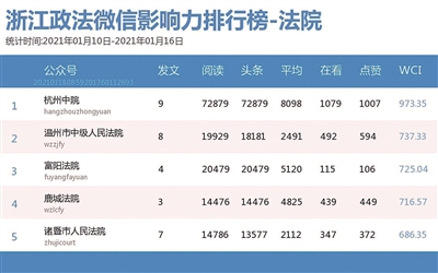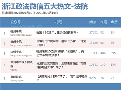 法院榜上,“杭州中院”持续上周势头,稳拿第一。值得一提的是,该公众号的3篇文章包揽了热文榜前三甲,《收藏!2021年,建议借条这样写》一文阅读量最高。该文根据民法典新规分点详解了写借条的“攻略”,非常实用。