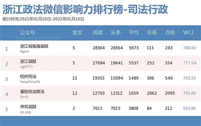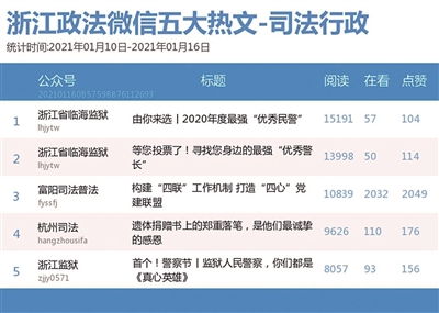 司法行政榜上,黑马“浙江省临海监狱”成为第一。不仅如此,该公众号的2篇热文包揽了热文榜的冠亚军。1月12日,省临海监狱2020年度“优秀民警”微信投票正式启动,活动一经发布就吸引了1.5万名网友的关注。趁着热度,该公众号又于1月14日推出了最强“优秀警长”评选活动。看来,这样多项活动并行的方式也是吸粉的好招。