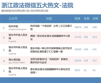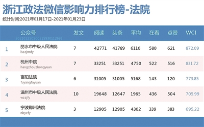 本期法院榜,“丽水市中级人民法院”强势登顶,斩获影响力榜冠军,杭州中院、富阳法院紧随其后。热文榜上,“杭州中院”凭借《杭州法院“十佳法官”公布|以三正建三信》一文夺得冠军,文章向读者展示了一群捍卫人民利益的“可爱的人”。