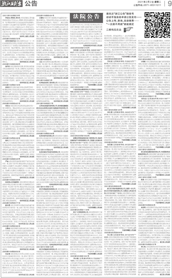 (2021)浙0108民初8号 王红:本院受理原告臧洪霞诉被告王红民间借贷纠纷一案,因你下落不明,现依法向你公告送达起诉状副本、应诉通知书。举证通知书及开庭传票等。自本公告发出之日起,经过60日即视为送达。本案适用简易程序审理,提出答辩状和举证期限分别为公告期满后的15日和15日内。本院定于2021年4月19日下午15时00分在本院第四法庭公开开庭审理,逾期将依法缺席判决。杭州市滨江区人民法院(2021)浙0108民初73号 杭州铭垚装饰工程有限公司:本院受理原告陈美林诉被告杭州铭垚装饰工程有限公司装饰装修合同纠纷一案,因你下落不明,现依法向你公告送达起诉状副本、应诉通知书、举证通知书及开庭传票等。自本公告发出之日起,经过60日即视为送达。本案适用简易程序审理,提出答辩状和举证期限分别为公告送达期满后的15日和15日内。本院定于2021年04月15日15:00在本院第六法庭公开开庭审理,逾期将依法缺席判决。杭州市滨江区人民法院(2021)浙0108民初217号 北京世纪奥通科技有限公司、杭州数投融曜投资合伙企业(有限合伙)浙江浩渺通讯科技有限公司:本院受理原告浙江华数广电网络股份有限公司诉被告北京世纪奥通科技有限公司、杭州数投融曜投资合伙企业(有限合伙)浙江浩渺通讯科技有限公司公司解散纠纷一案,因你们下落不明,现依法向你们公告送达起诉状副本、应诉通知书、举证通知书及开庭传票等,自本公告发出之日起,经过60日即视为送达。本案适用简易程序审理,提出答辩状和举证期限分别为公告送达期满后的15日和15日内,本院定于2021年04月15日11:00在本院第九法庭公开开庭审理,逾期将依法缺席判决。杭州市滨江区人民法院(2020)浙0108民初3546号 杭州享诺科技有限公司:本院对原告宁波鑫乐蛋品有限公司诉被告杭州享诺科技有限公司买卖合同纠纷一案已审理终结。现依法向你公告送达本院民事裁定书[案号:(2020)浙0108民初3546号]。自公告之日起60日内来本院领取裁判文书,逾期则视为送达。杭州市滨江区人民法院