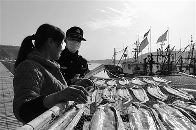临近春节,渔嫂们忙着准备年货,晒鱼干、腌制鱼货。近日,象山县公安局石浦港区派出所组织警力在沿海码头一线开展禁毒宣传,向渔嫂发放宣传手册,鼓励她们长吹“耳边风”,携手构建无毒港区。通讯员 翟志浩