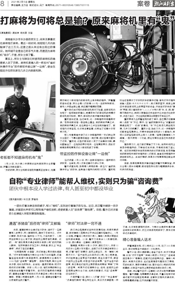 事实上,贺女士与牌友们所使用的麻将机的确是被人动了手脚。麻将机里植入的一款名叫“雀时快操作平台”的作弊软件能让牌“一边倒”,使坐在指定方位的玩家在几步之内就能和牌。