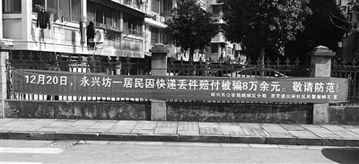 横幅上写着:“XXX小区有居民因快递丢件赔付被骗8万余元,敬请防范!”落款是绍兴市公安局越城区分局灵芝派出所民警。
