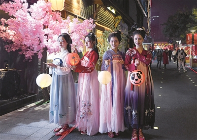 2月7日晚,在成都市成华区望平滨河路,身着汉服的游客在合影留念。