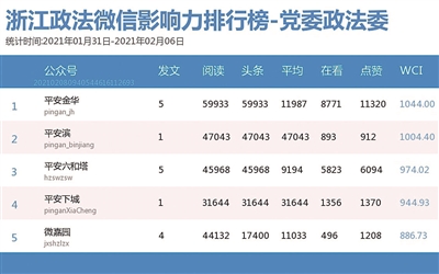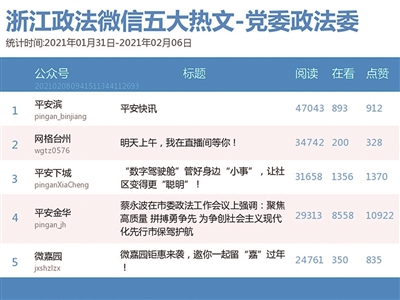 本期党委政法委榜,新晋黑马“平安金华”一举夺冠,“平安滨”和“平安六和塔”紧随其后。热文榜上,“平安滨”发布的《平安快讯》一文,聚焦杭州市滨江区平安建设工作动态,获得4.7万阅读量,跻身热文榜第一。