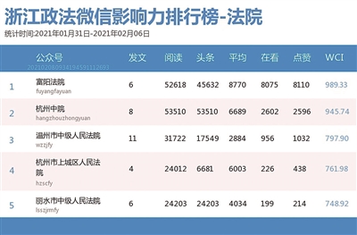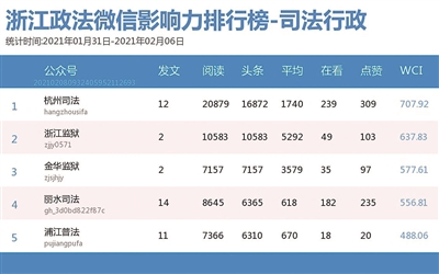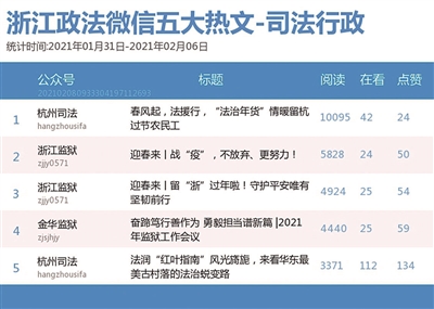 本期司法行政榜,“杭州司法”继续“霸榜”,其发布的《春风起,法援行,“法治年货”情暖留杭过节农民工》和《法润“红叶指南”风光旖旎,来看华东最美古村落的法治蜕变路》,同时拿下热文榜第一名和第五名。