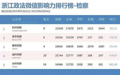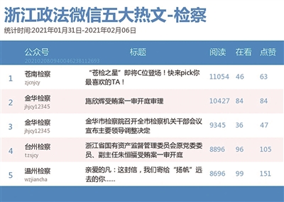 本期检察院榜,前三名分别是“杭州检察”“金华检察”“富阳检察”。热文榜上, “苍南检察”发布的《“苍检之星”即将C位登场!快来pick你最喜欢的TA!》成为黑马,跃居榜首。看来,热文想要吸睛又吸粉,网友参与度高的活动少不了。