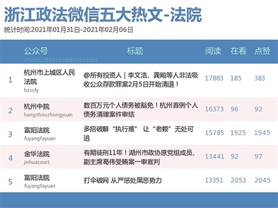 本期法院榜,“富阳法院”“杭州中院”“温州市中级人民法院”拿下影响力榜前三。热文榜上,黑马“杭州市上城区人民法院”发布的《@所有投资人|李文浩、龚飚等人非法吸收公众存款罪案2月5日开始清退!》一文夺魁。为维护受损投资人的合法权益,上城区人民法院现依据生效刑事裁判文书和信息核实登记情况对已归集到位的涉案资金进行首次资金清退工作,该举措得到网友点赞。