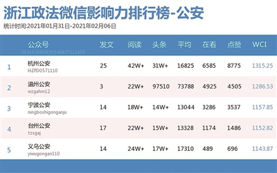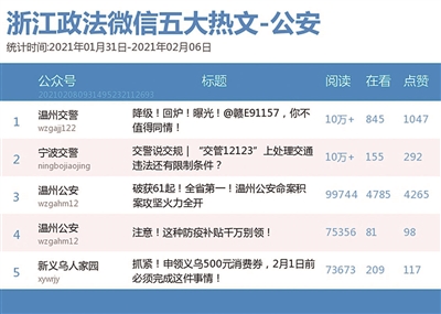 本期公安榜,“杭州公安”再发力,摘得影响力排行榜榜首位置。热文榜上有2篇阅读量10万+好文,分别是“温州交警”发布的《降级!回炉!曝光!@赣E91157,你不值得同情!》和“宁波交警”发布的《交警说交规|“交管12123”上处理交通违法还有限制条件?》。