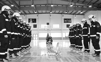 体育馆里,消防员们玩得不亦说乎。“这些游戏都是大家自创的,既有趣味性,又具有消防特色。”百官消防救援站指导员王吉介绍道。所谓打“保龄球”,其实就是在地上摆了15瓶矿泉水,然后消防员模拟甩水带训练的方式,用甩出去的水带击打前方的矿泉水瓶。