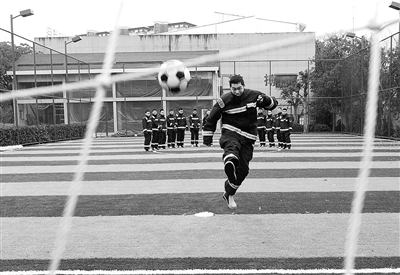 与打“保龄球”相比,趣味射门的现场更加“刺激”。一名消防员双手从胸前交叉后,一手捏着鼻子,一手指着地面,伴随着一旁消防员“1、2、3……10”的数数声快速转完10圈后,跑向球门方向射门。只见消防员转完圈歪歪扭扭地跑去射门,不时还人仰马翻,大伙笑作一团。