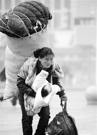 | 2010年1月30日,巴木玉布木背着大包、怀抱孩子在南昌火车站赶车回家。 |