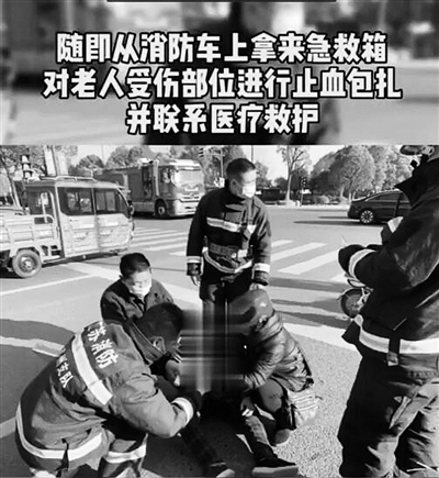 近日,江苏张家港市凤凰镇凤星路红绿灯路口,一名老太太骑行三轮自行车时摔倒。这一幕正好被出警返回途中的凤凰消防救援站指战员看到,消防队员们下车将老人及自行车扶起,对老人受伤部位进行止血包扎,并联系了医疗救护队。