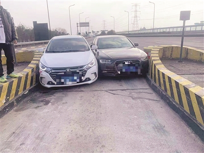卫庭:前几天,这个画面在G2504杭州绕城高速公路新街收费站出口处出现了。一辆白色轿车与一辆黑色轿车在ETC车道内挤得“头破血流”,结果谁也进不去,谁也出不来。