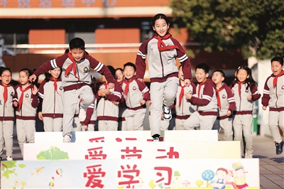 2月22日,在安徽省合肥市和平小学,学生在参加“勇往直前”趣味心理游戏。