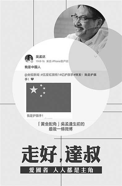 在真实生活中,达叔也从不敷衍。他生前留下的最后一条微博写着“我是中国人”,令无数网友集体致敬。透过这短短五个字,人们读懂了他对国家朴素而自然的爱。