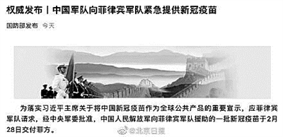 2月28日,据@国防部发布(国防部新闻局官方微博),应菲律宾军队请求,经中央军委批准,中国人民解放军向菲律宾军队援助的一批新冠疫苗于当日交付菲方。