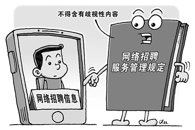 《网络招聘服务管理规定》自3月1日起施行。规定明确,用人单位向人力资源服务机构提供的单位基本情况、招聘人数、招聘条件、用工类型、工作内容、工作条件、工作地点、基本劳动报酬等网络招聘信息,应当合法、真实,不得含有民族、种族、性别、宗教信仰等方面的歧视性内容。其招聘信息不得违反国家规定在户籍、地域、身份等方面设置限制人力资源流动的条件。 新华社 徐骏