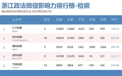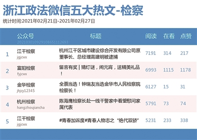 本期检察院榜,“江干检察”表现不凡,除了拿下影响力榜冠军外,还有2篇文章入围热文榜前五名,其中《杭州江干区城市建设综合开发有限公司原董事长、总经理高建明被逮捕》一文成为“榜眼”。腐败是人民的公敌,严惩腐败分子是党心民心所向!