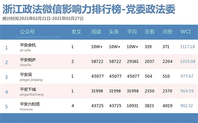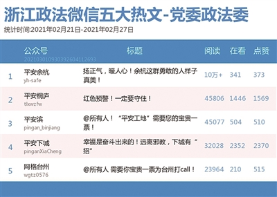 本期政法委榜出现“双料”三甲,分别是“平安余杭”“平安桐庐”“平安滨”。热文榜上,“平安余杭”的《扬正气,暖人心!余杭这群勇敢的人样子真美!》一文阅读量突破“10万+”,这篇推文讲述了杭州市余杭区各乡镇(街道)暖心民警、网格员的故事,一度在朋友圈刷屏。