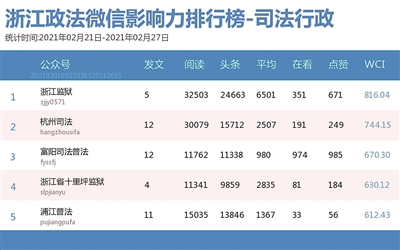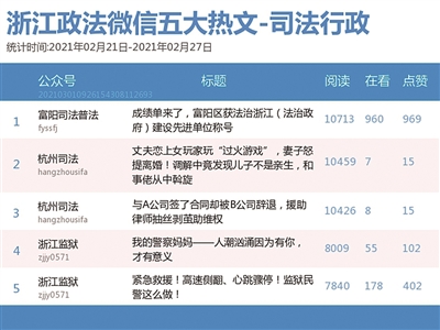 本期司法行政榜,“浙江监狱”成为影响力榜第一名,而热文榜的第一名被“富阳司法普法”的热文《成绩单来了,富阳区获法治浙江(法治政府)建设先进单位称号》拿下。近日,法治浙江建设考评成绩出炉,杭州市富阳区获法治浙江(法治政府)建设先进单位,法治浙江建设社会满意度蝉联杭州市第一,全省位居第四,该文对富阳区法治政府建设的做法进行了详细介绍,值得借鉴学习。
