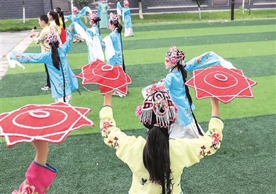图为陕西省汉中市洋县城西小学戏剧社团的孩子们在校园里排练秦腔《春满洋州》。