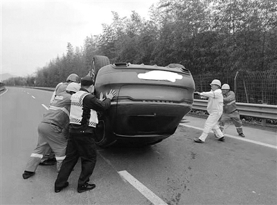 高速交警杭州支队一大队民警率先到达,发现一辆浙A牌照的保时捷轿车四轮朝上,翻在第二车道,车上人员刚从车里爬了出来。