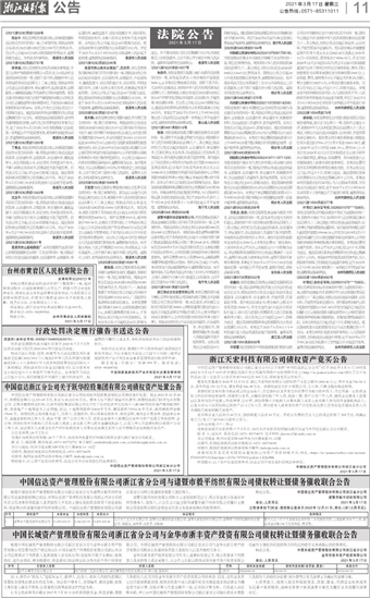(2020)浙0483民初6164号 许陈峰(公民身份号码332524197508170018):本院受理原告蔡龙生诉被告许陈峰买卖合同纠纷一案,现已经审理终结。现依照《中华人民共和国民事诉讼法》第九十二条之规定,向你公告送达(2020)浙0483民6164号民事判决书。限你自公告之日起60日内来本院领取民事判决书,逾期即视为送达。如不服本判决,可在公告期满后十五日内,向本院递交上诉状及副本,上诉于浙江省嘉兴市中级人民法院。逾期本判决即发生法律效力。桐乡市人民法院(2021)浙0483民初1370号 冯尚奎(公民身份号码332621197203014256):本院受理原告桐乡市濮院亿东毛纱经营部诉被告冯尚奎买卖合同纠纷一案,现依法向你公告送达起诉状副本、证据副本、应诉通知书、举证通知书、转换程序材料、合议庭组成人员通知书、及开庭传票等。自本公告发出之日起,经过60日,即视为送达。提出答辩状的期限为公告送达期满后的15日内,举证期限为公告送达期满后的30日内。本案定于举证期限届满后的第3日上午09时30分(遇节假日顺延)在本院濮院法庭第一法庭开庭审理,逾期将依法判决。桐乡市人民法院(2021)浙0483民初955号 胡桂英(公民身份号码33062419711107112X):本院受理原告桐乡市久喜纺织有限公司诉被告胡桂英买卖合同纠纷一案,现依法向你公告送达起诉状副本、证据副本、应诉通知书、举证通知书、转换程序材料、合议庭组成人员通知书、及开庭传票等。自本公告发出之日起,经过60日,即视为送达。提出答辩状的期限为公告送达期满后的15日内,举证期限为公告送达期满后的30日内。本案定于举证期限届满后的第3日上午09时00分(遇节假日顺延)在本院濮院法庭第一法庭开庭审理,逾期将依法判决。桐乡市人民法院