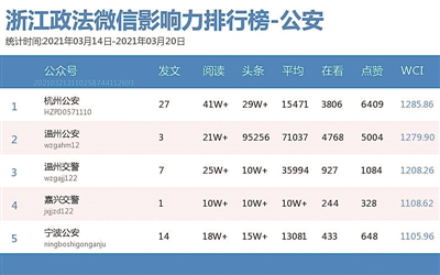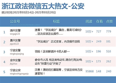 本期公安榜前三名依次是“杭州公安”“温州公安”“温州交警”。其中,“温州交警”的《速看!“学法减分”重启,最高可减6分,这次应该这么操作……》一文获得“10万+”阅读数,拿下热文榜冠军。该文通过图解的形式“手把手”教会市民如何操作驾驶证“学法减分”平台,简洁易懂,非常实用。