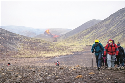 3月21日,人们徒步走在冰岛雷克雅尼斯半岛喷发的火山不远处。