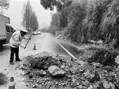 近日,受持续降雨影响,327省道临海市涌泉段公路发生塌方,影响车辆通行。临海交警火速赶到现场,设置警示标志,将道路上的土石搬移。