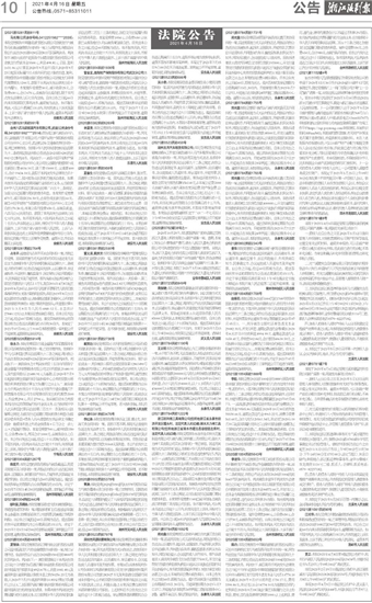 (2021)浙1004民初1708号 赵菊花:本院受理(2021)浙1004民初1708号原告中国农业银行股份有限公司台州路桥支行与你信用卡纠纷一案,因你外出,下落不明,依照《中华人民共和国民事诉讼法》第九十二条之规定,向你公告送达起诉状副本、应诉材料、开庭传票及举证通知书(举证期限截至2021年07月05日)。一、判令被告立即归还原告透支本金29482.35元,并支付利息、逾期还款违约金等(截至2020年8月27日应付的利息8994.99元、逾期还款违约金1650.41元,手续费502.84元,合计款项40630.59元,之后按照中国农业银行金穗贷记卡领用合约规定计算至实际履行完毕之日止);二、本案诉讼费由被告承担。自本公告发出之日起,经过六十日,即视为送达。提出答辩状的期限为公告送达期满后的十五日内,并定于2021年07月06日09时20分在本院第十三审判庭公开开庭进行审理,逾期将依法缺席判决。台州市路桥区人民法院(2021)浙1004民初1888号 李挺:本院受理(2021)浙1004民初1888号原告中国农业银行股份有限公司台州路桥支行与你为信用卡纠纷一案,因你外出,下落不明,依照《中华人民共和国民事诉讼法》第九十二条之规定,向你公告送达起诉状副本、应诉材料、开庭传票及举证通知书(举证期限截至2021年07月05日)。一、请求法院判令被告偿还中国农业银行金穗贷记卡透支本金79505.86元及截至2020年10月30日的利息35530.66元、逾期还款违约金4963.22元、消费手续费561.60元,合计人民币120561.34元,并支付自2020年10月31日起至实际履行完毕之日止按中国农业银行金穗贷记卡领用合约约定的利息;二、本案诉讼费由被告承担。自本公告发出之日起,经过六十日,即视为送达。提出答辩状的期限为公告送达期满后的十五日内,并定于2021年07月06日09时20分在本院第十三审判庭公开开庭进行审理,逾期将依法缺席判决。台州市路桥区人民法院(2020)浙1004民初5643号 李谊华:本院受理原告中国工商银行股份有限公司台州路桥支行与被告李谊华金融借款合同纠纷一案,因你外出住址不详,依照《中华人民共和国民事诉讼法》第九十二条的规定,向你公告送达本院(2020)浙1004民初5643号民事判决书。判决被告李谊华于判决发生法律效力之日起十日内偿还原告中国工商银行股份有限公司台州路桥支行信用卡透支本金84572.66元,并支付以上述本金为基数按领用协议和章程约定计算至实际履行之日止的利息、违约金(以月利率2%为限)。如未按判决指定的期间履行给付金钱义务,应当依照《中华人民共和国民事诉讼法》第二百五十三条之规定,加倍支付迟延履行期间的债务利息。案件受理费2080元,公告费650元,合计2730元,由被告李谊华负担。自本公告发出之日起,经过六十日即视为送达。如不服本判决,可在判决书送达之日起十五日内,向本院递交上诉状及副本,上诉于浙江省台州市中级人民法院。台州市路桥区人民法院(2020)浙1004民初5653号 陈丹:本院受理原告中国邮政储蓄银行股份有限公司台州市路桥区支行与被告陈丹信用卡纠纷一案,因你外出住址不详,依照《中华人民共和国民事诉讼法》第九十二条的规定,向你公告送达本院(2020)浙1004民初5653号民事判决书。判决如下 :被告陈丹于判决发生法律效力之日起十日内归还原告中国邮政储蓄银行股份有限公司台州市路桥区支行信用卡透支本金人民币14774.10元及截至2020年9月17日的利息1730.17元、费用3390.86元,并支付以本金14774.10元为基数按合同约定利率自2020年9月18日起计算至实际履行之日止的利息、费用、违约金及律师代理费1000元(上述利息、费用、违约金、律师代理费合计以不超过月利率2%为限)。如未按判决指定的期间履行给付金钱义务,应当依照《中华人民共和国民事诉讼法》第二百五十三条之规定,加倍支付迟延履行期间的债务利息。案件受理费330元,公告费650元,合计980元,由被告陈丹负担。自本公告发出之日起,经过六十日即视为送达。如不服本判决,可在判决书送达之日起十五日内,向本院递交上诉状及副本,上诉于浙江省台州市中级人民法院。台州市路桥区人民法院(2021)浙1102破4号 丽水市中级人民法院根据浙江伟荣家电有限公司的申请于2020年12月30日作出(2020)浙11破申12号民事裁定书,裁定受理浙江上一阀门有限公司(下称“上一公司”)破产清算一案,并指定浙江法和律师事务所担任管理人。丽水市中级人民法院于2021年3月10日作出(2021)浙11民辖15号民事裁定书,裁定由浙江省丽水市莲都区人民法院审理。上一公司的债权人应于2021年5月20日前向管理人(通讯地址:浙江省丽水市城北街368号山山梦想城入座6楼;联系人:叶媛;联系电话:13666557077)申报债权(线上债权申报方式:电脑登录破易通破产办案工作平台https://zqr.poyitong.com申报债权,本案件识别码:HFmuNG),书面说明债权数额、有无财产担保及是否属于连带债权,并提供相关证据材料。未在上述期限内申报债权的,可以在破产财产分配方案提交债权人会议讨论前补充申报,但此前已进行的分配无权要求补充分配,同时还要承担为审查和确认补充申报债权所产生的费用。未申报债权的,不得依照《中华人民共和国企业破产法》规定的程序行使权利。上一公司的债务人或财产持有人应向上一公司管理人清偿债务或交付财产。本院定于2021年5月25日上午09时30分在本院第十四审判庭召开第一次债权人会议。依法申报债权的债权人有权参加债