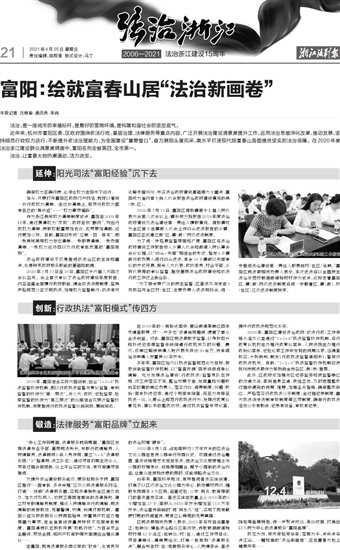 近年来,杭州市富阳区委、区政府围绕依法行政、基层治理、法律服务等重点内容,广泛开展法治建设满意度提升工作,运用法治思维深化改革、推动发展,坚持规范行政权力运行,不断提升依法治理能力,为全面建设“重要窗口”,奋力展现头雁风采,高水平打造现代版富春山居图提供坚实的法治保障。在2020年度法治浙江建设群众满意度调查中,富阳名列全省第四、全市第一。