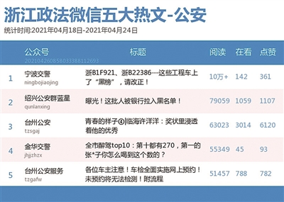 本期公安榜,“台州公安”“杭州公安”“宁波公安”分列前三。热文榜上,“宁波交警”《浙B1F921、浙B22386……这些工程车上了“黑榜”,请改正!》一文,获得“10万+”阅读量。减少交通安全隐患,保障群众出行安全,各位工程车司机请文明驾驶。