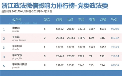 本期政法委榜,“微嘉园”继续蝉联影响力榜冠军,其热文《张兵:扎实开展网格走访,以全方位平安、全方位精彩庆祝中国共产党成立100周年》,获得最高阅读数和点赞量。