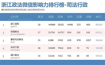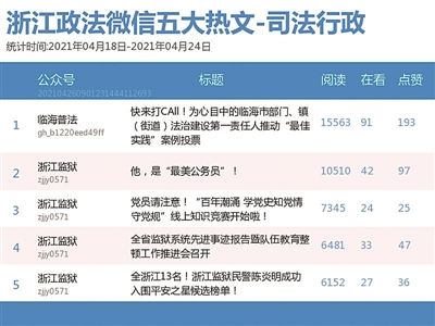 司法行政榜上,“浙江监狱”再获第一。“临海普法”突出重围,拿下热文榜首,其《快来打CAll!为心目中的临海市部门、镇(街道)法治建设第一责任人推动“最佳实践”案例投票》获得最高阅读。法治临海如何建设?答案就在这一个个案例中。