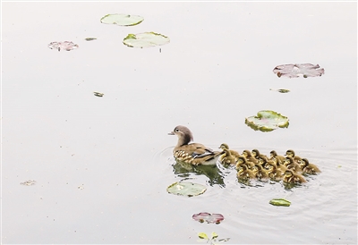 4月28日,杭州西湖孤山水域,鸳鸯妈妈带着刚出生的15只鸳鸯宝宝在湖面上游曳觅食。当天一个上午,就有3窝鸳鸯宝宝陆续跳出树洞,亮相西湖。