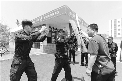 民警指导校园保安使用盾牌、钢叉等器械应对“暴恐分子“,进一步增强校园保安安全防范意识和应急处突能力。