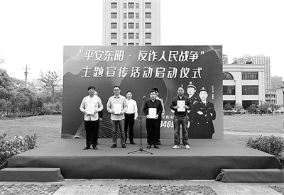本报讯 4月27日,“平安东阳·反诈人民战争”主题宣传活动,在东阳江北街道反诈主题公园正式启动。东阳18个镇乡街道于当天同步启动了反诈主题宣传活动。6000余人参加活动,走访群众20余万户,发放反诈宣传资料90万份。