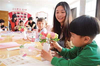近日,温岭市滨海镇靖海村文化礼堂里,10多名孩子动手制作布艺手工花束,送给自己的妈妈。母亲节来临,滨海镇推出“我的母亲是党员”“母亲节关爱党员妈妈”等活动,为母亲们送上诚挚祝福。